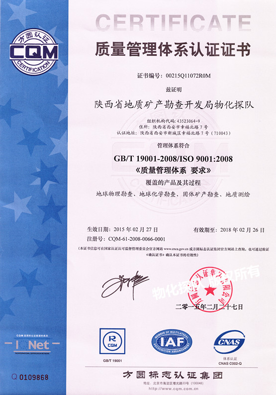 ? ? 我隊于2015年2月27日獲得了方圓標志認證集團有限公司認可的質量管理體系(換版認證)〔GB/T19001-2008〕、環(huán)境管理體系〔GB/T24001-2004〕、職業(yè)健康安全管理體系〔GB/T28001-2001〕三大認證證書。