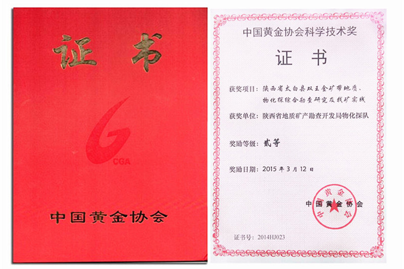 ? ? 物化探隊承擔(dān)的2014年完成的“陜西省太白縣雙王金礦帶地質(zhì)、物化探綜合勘查研究及找礦實踐”項目,榮獲中國黃金協(xié)會頒發(fā)的“科學(xué)技術(shù)二等獎”。同時獲此殊榮的個人有項目負(fù)責(zé)毛軍衛(wèi)、技術(shù)負(fù)責(zé)馮旭輝、技術(shù)員劉昊培。