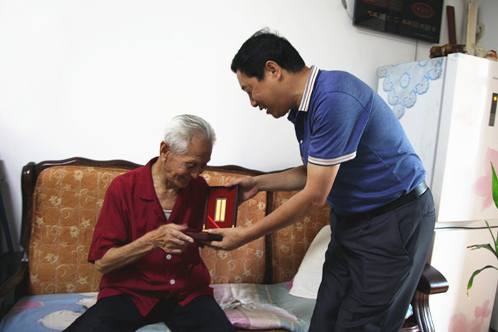 ? ? 隊(duì)長(zhǎng)王新坪登門(mén)看望了王喜慶老人,“我代表隊(duì)黨政領(lǐng)導(dǎo)來(lái)看望慰問(wèn)您,感謝您為黨、為國(guó)家、為人民作出的貢獻(xiàn)”。并給他送上黨中央、國(guó)務(wù)院、中央軍委授予的“中國(guó)人民抗日戰(zhàn)爭(zhēng)勝利70周年紀(jì)念章”和慰問(wèn)金。王新坪躬身握住老人的手,關(guān)切詢(xún)問(wèn)他的身體健康狀況、生活起居等,希望他多多保重、健康長(zhǎng)壽,并要求隨行的有關(guān)部門(mén)負(fù)責(zé)同志要及時(shí)幫助解決老干部生活中遇到的困難。