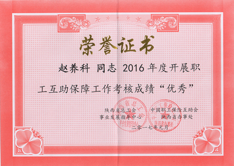 ? ?2017年1月13日,在陜西省職工互助保障工作會(huì)議上,對(duì)2016年度在陜西省職工互助保障工作中成績(jī)突出的先進(jìn)單位和優(yōu)秀個(gè)人進(jìn)行了表彰,我隊(duì)工會(huì)被陜西省總工會(huì)事業(yè)發(fā)展指導(dǎo)中心和中國(guó)職工保險(xiǎn)互助會(huì)陜西省辦事處聯(lián)合授予“先進(jìn)集體”榮譽(yù)稱(chēng)號(hào),授予工會(huì)主席趙養(yǎng)科同志“優(yōu)秀個(gè)人”榮譽(yù)稱(chēng)號(hào)。